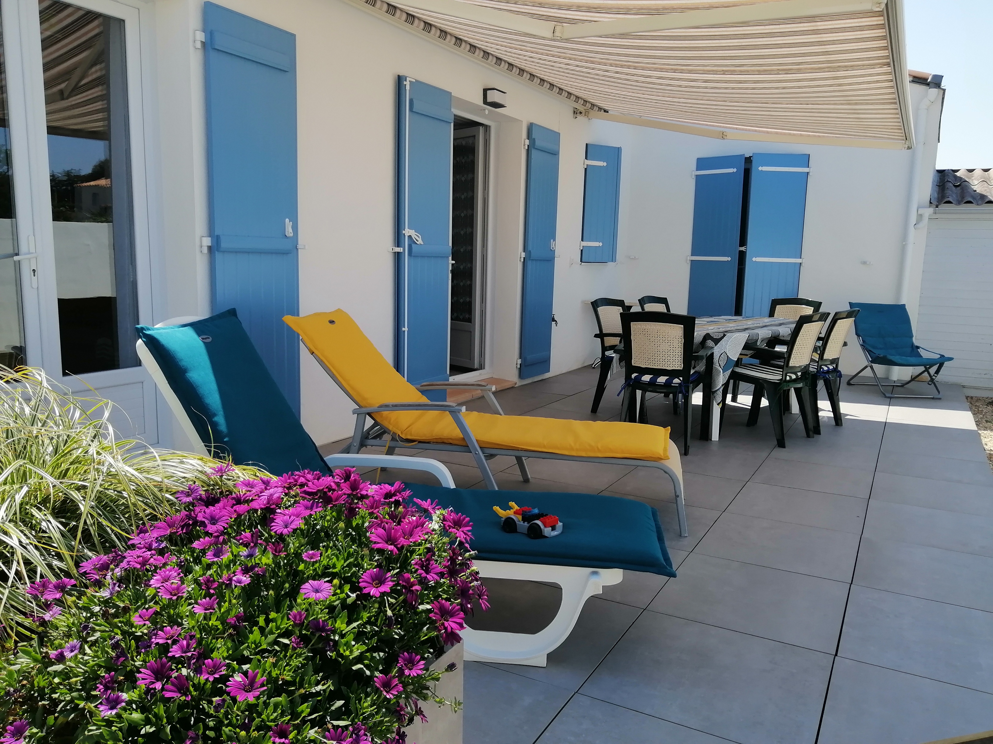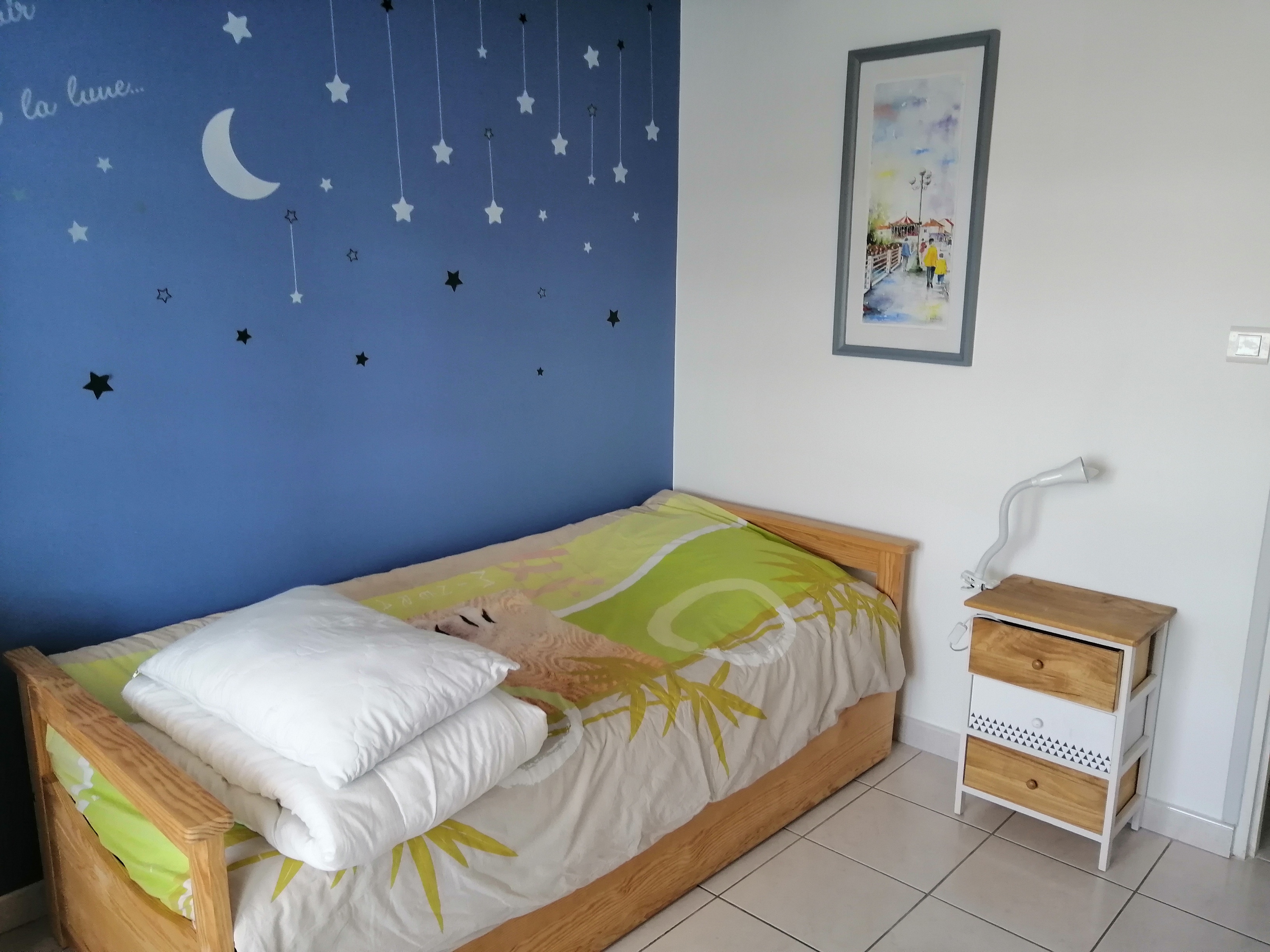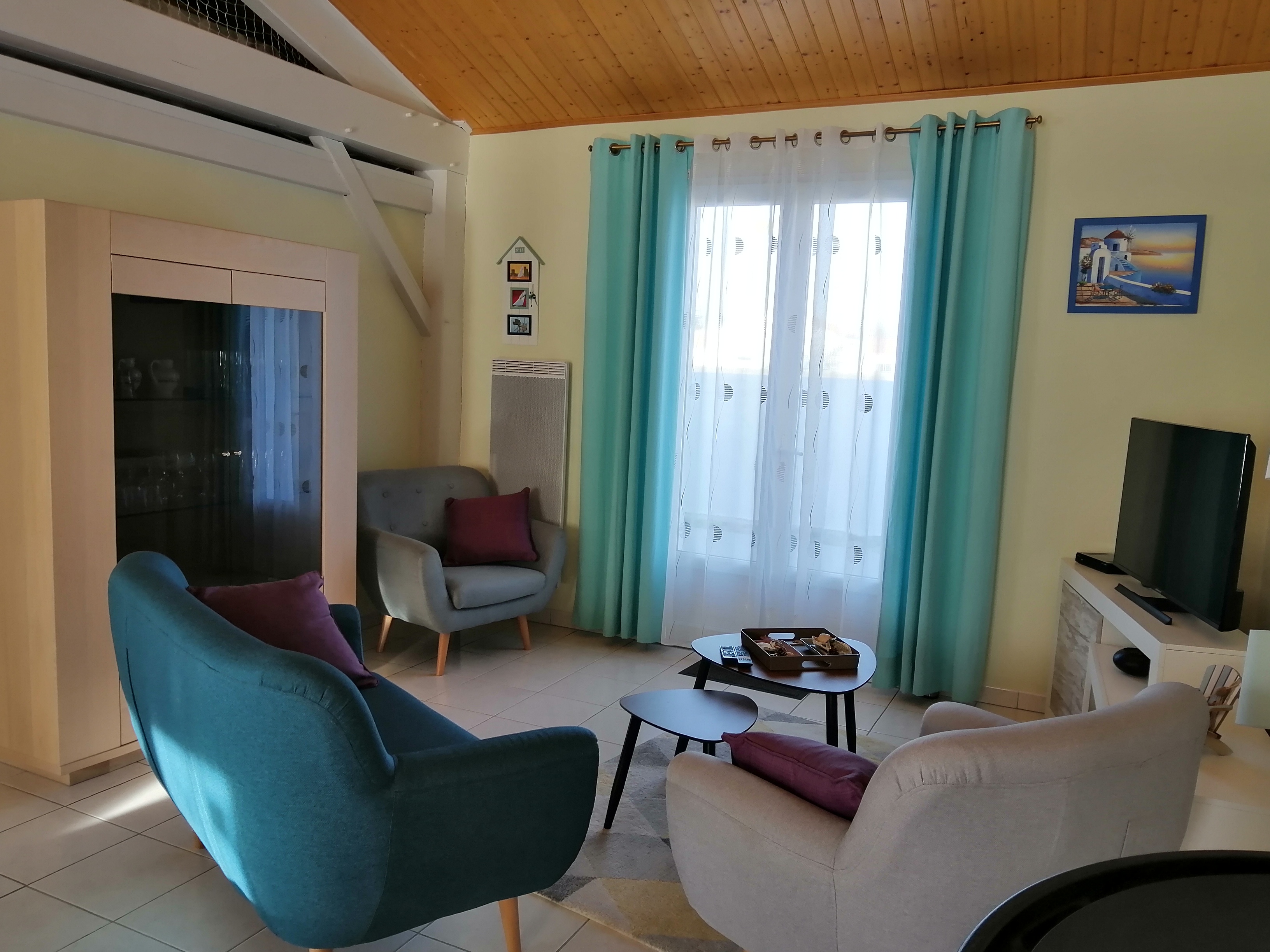 Maison confortable pouvant accueillir 8 personnes - 93 m² environ comprenant un séjour/salon (poêle à bois interdit à l'utilisation), cuisine aménagée et équipée, une chambre avec un lit en 140, une chambre avec un lit en 140, un coin nuit avec 2 lits gigognes en 90 et sa salle d'eau avec douche à l'italienne, une mezzanine à hauteur réduite avec un canapé clic-clac en 140 et un lit en 120, une salle d'eau avec douche à l'italienne, un wc, cellier. Equipement bébé : matelas à langer, siège pliant adaptable sur chaise, baignoire, lit parapluie avec matelas, Lave-linge, télévision, plaque induction, four, micro-ondes, lave-vaisselle, congélateur, cafetière nespresso, robot Air Fryer, wifi GRATUITE. Jardin clos avec terrasse sur l'avant et sur l'arrière, store banne sur l'arrière, salon de jardin, 2 bains de soleil, 2 transats, barbecue. Stationnement sur la propriété et/ou dans l'impasse. Animaux non admis. Possibilité d'un forfait ménage de 130 €.